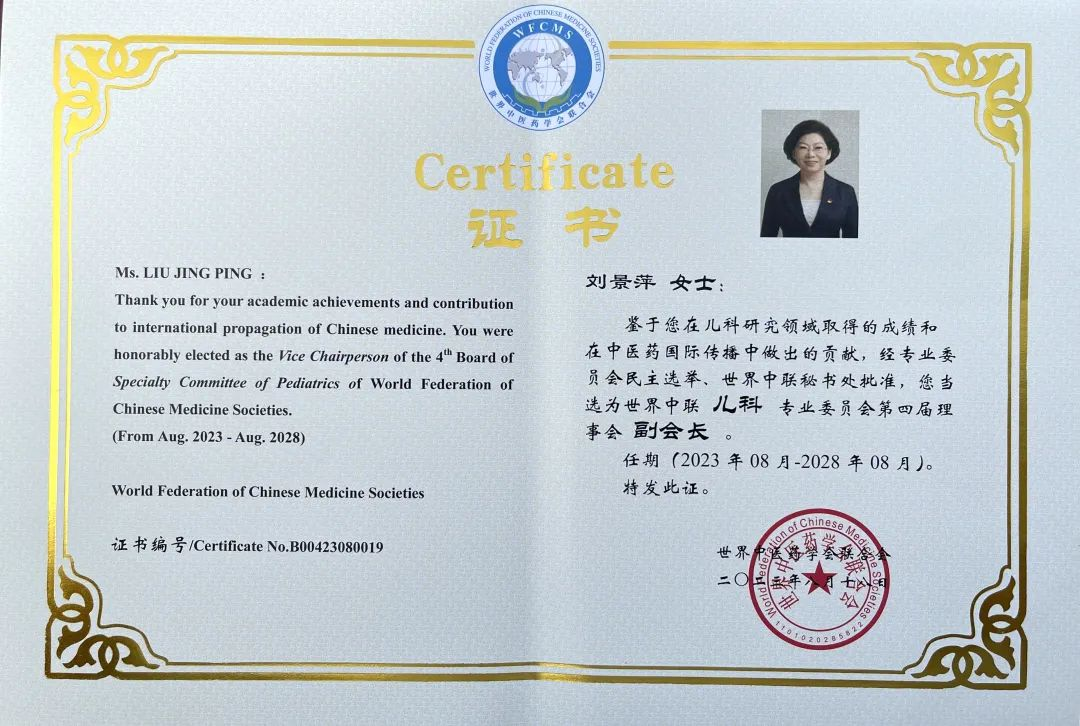 YP街机电子药业集团党委书记、董事长刘景萍当选世界中医药学会联合会儿科专业委员会第四届理事会副会长